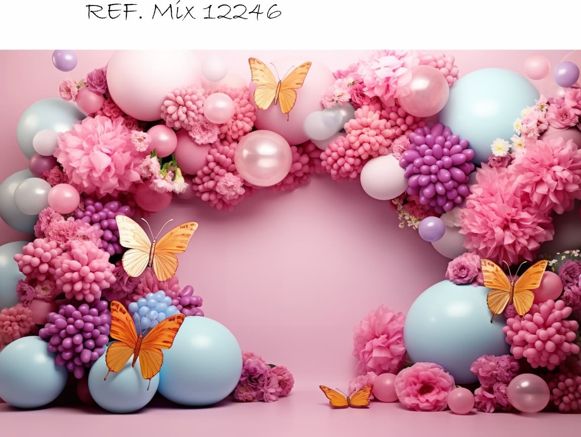 Fundo Fotográfico Sublimado Balões, Borboletas e flores rosa