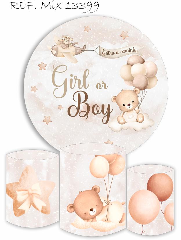 Kit Painel Redondo Sublimado Cha Revelação + Trio de Cilindros Veste Fácil