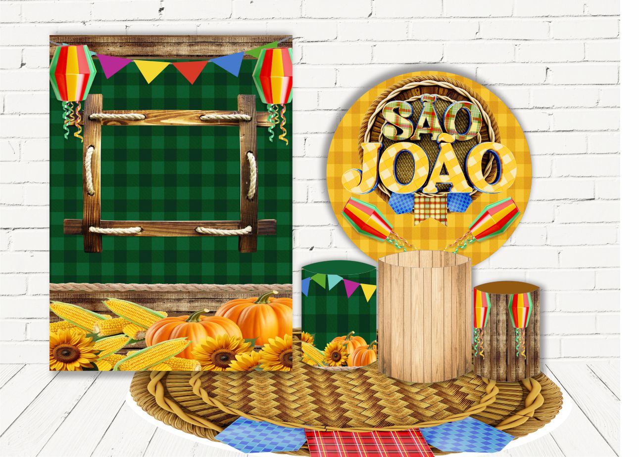 Painel Redondo Sublimado Festa Junina + Trio de Cilindros Veste Fácil + Painel Lateral + Tapete
