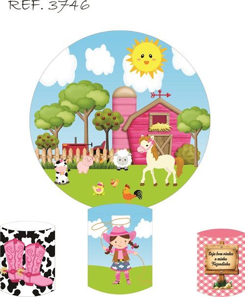 Painel Redondo Sublimado Fazendinha + Trio de Cilindros Veste Fácil