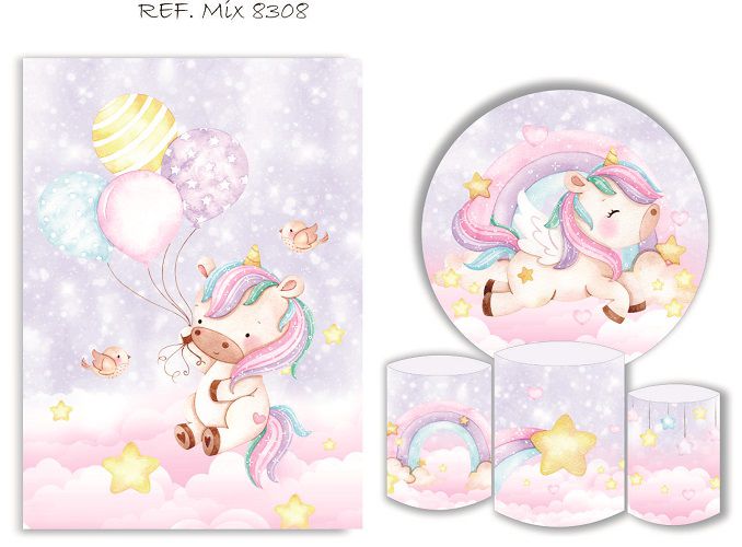 Painel Redondo Sublimado Unicórnio + Trio de Cilindros Veste Fácil + Painel Lateral