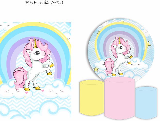 Painel Redondo Sublimado Unicórnio + Trio de Cilindros Veste Fácil + Painel Lateral